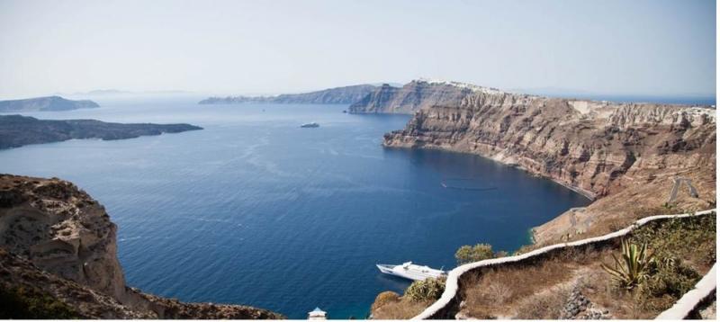 The Main Hall leads to a beautiful terrace (external area) with a palm tree, overlooking the caldera.